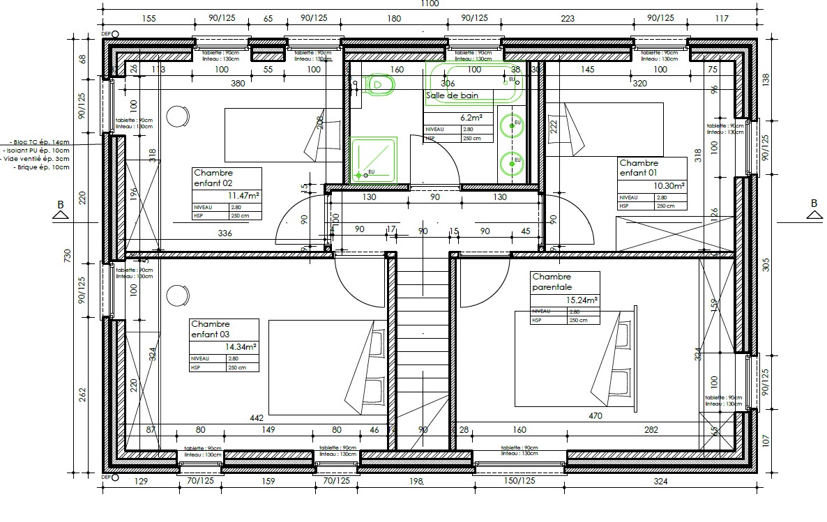 1ier Etage : Hall de nuit, salle de bain et 4 chambres.